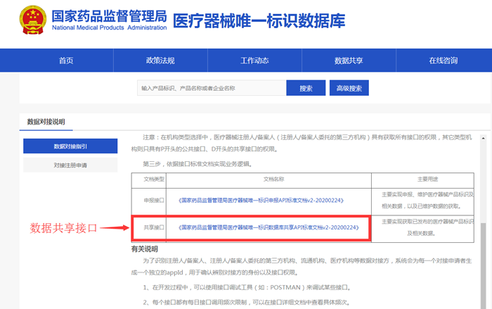 醫療器械唯一標識數據庫設置接口對接的數據共享方式,點擊首頁“數據對接說明”欄目,在線填報對接申請并獲取對接授權碼。下載《國家藥品監督管理局醫療器械唯一標識數據庫共享API標準文檔》最新版(圖4所示),按文檔要求開發對接功能,經聯調測試通過后,用戶可通過接口獲取數據。
